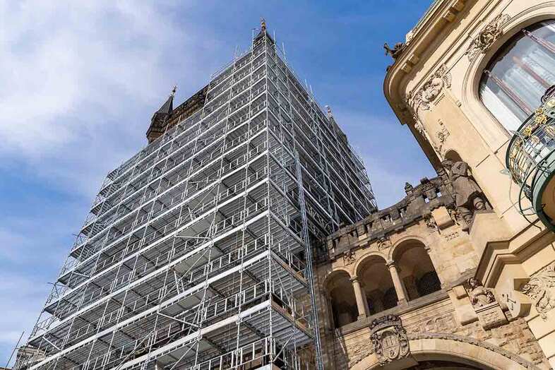 Lors du montage de l'échafaudage, de nombreux facteurs ont été pris en compte, le plus important étant la préservation du patrimoine de la ville de Prague. Pour ce faire, tous les ancrages ont été réalisés exclusivement entre les briques de la tour, plutôt que dans les briques elles-mêmes. En outre, une grande variété de consoles a été utilisée pour construire autour des statues de la tour, en veillant à ce que ces éléments historiques soient protégés. Enfin, la conception de l'échafaudage a également été adaptée à la construction angulaire de la tour, afin de garantir la stabilité et la sécurité tout en respectant l'architecture unique de celle-ci.