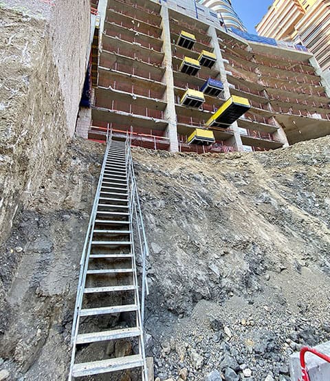 Le terrain sur lequel s’élève Testimonio II comporte plusieurs contraintes techniques, notamment une pente assez forte et un espace restreint. Afin de pallier ces deux exigences, les escaliers de talus en acier ont été utilisés pour créer des accès entre les deux niveaux créés à la phase de fondation, ainsi que des filets pare-gravats, destinés à protéger les compagnons sur site mais aussi le grand public passant à proximité.